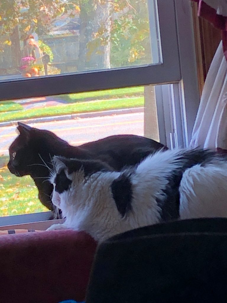 The cats are enjoying the open windows and the birds and squirrels bouncing around.