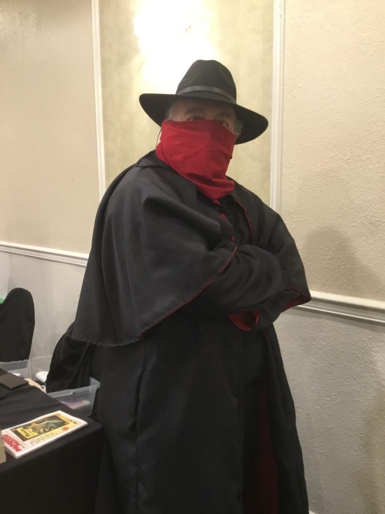 (for the VI: Peter dressed as the Shadow. He is wearing the red mask, fedora, and a black inverness coat with red lining)