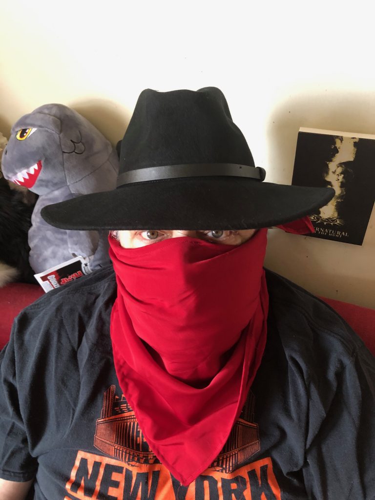 (For the VI: This is Peter wearing a red cloth as a mask and a black fedora)