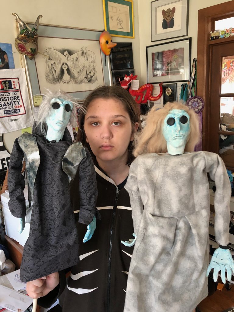 (For the VI: These are two rod puppets with Caroline holding them up. On the left is Ignorance with a light blue face and wild grey hair. He is wearing a black tunic and a dirty grey vest. On the right is Want. She has a light blue face and long blond hair. She is wearing a dress that looks very distressed and dirty.)